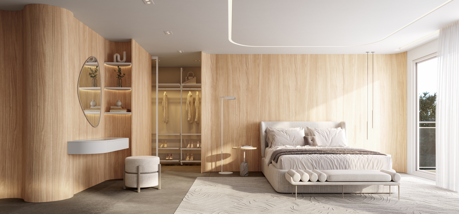As formas curvas e a madeira clara Rovere se unem para criar uma atmosfera de serenidade e