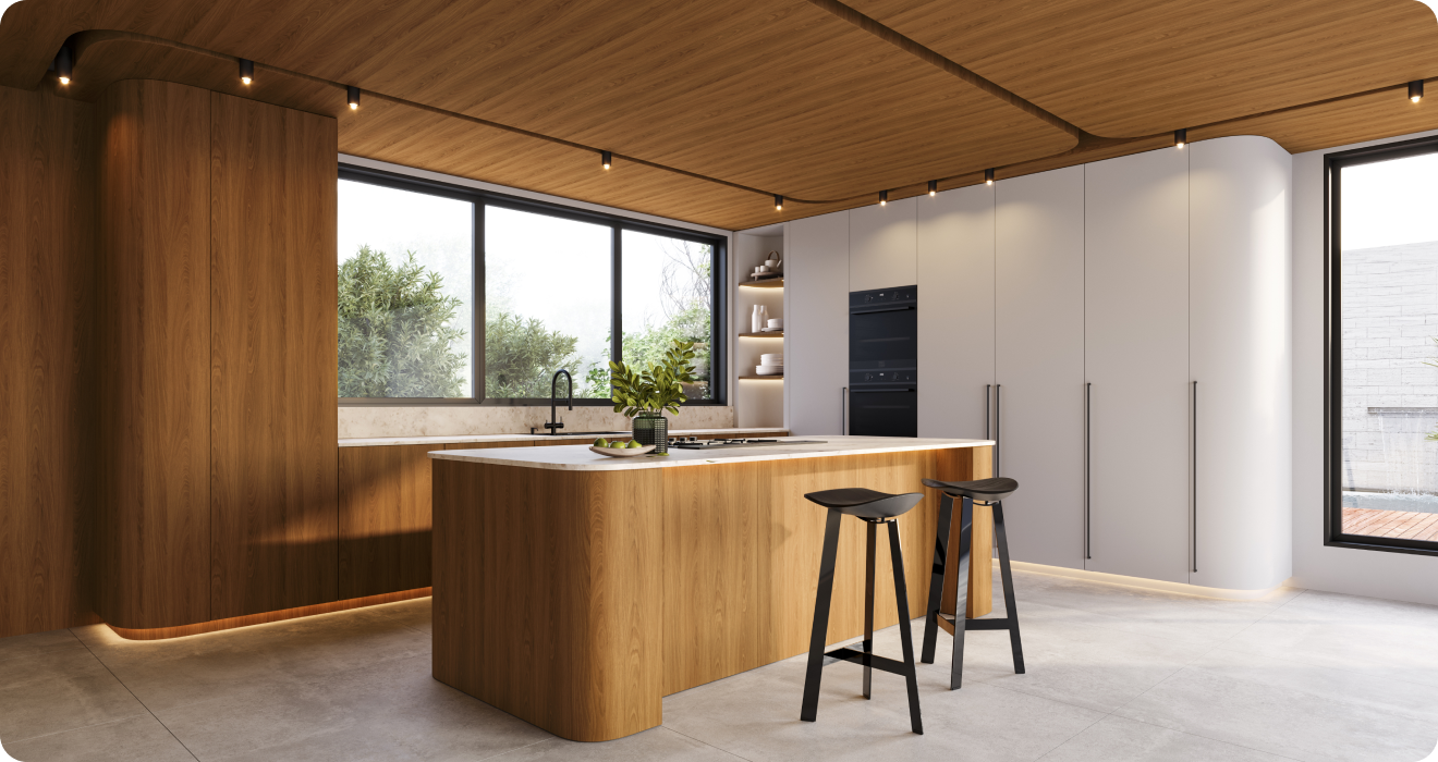 Formas orgânicas com linhas suaves, contornos fluidos e bordas arredondadas. Nesta cozinha, a