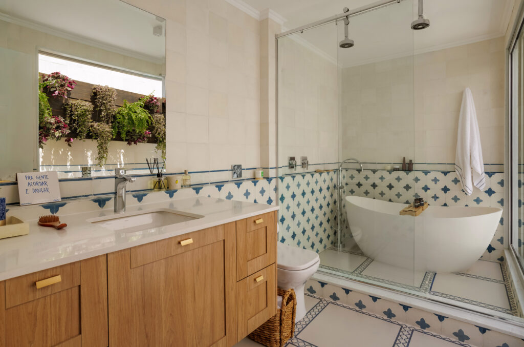 Para uma atriz, a relação com a autoimagem faz parte da profissão. Por isso, a penteadeira planejada se tornou peça-chave com uma bancada em Itapuã com rasgo em vidro, que mantém itens organizados, visíveis e prontos para uso.
