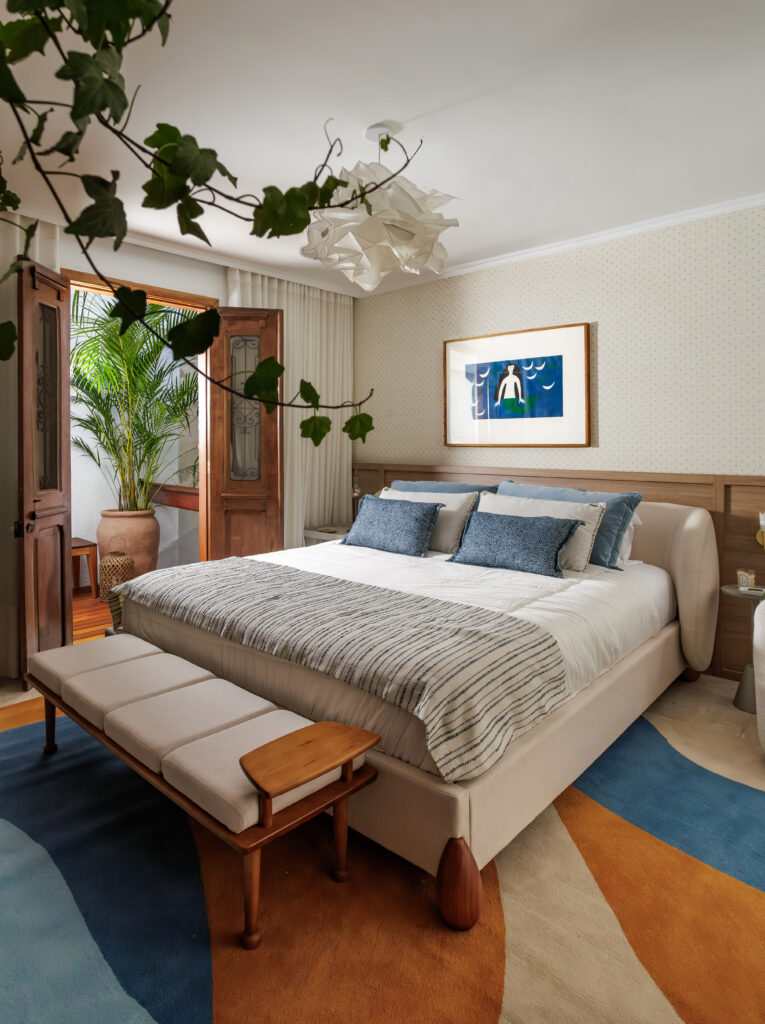 O painel em Itapuã funciona como uma moldura para a cabeceira, organizando visualmente o ambiente e criando um ponto focal acolhedor. Já a paginação almofadada adiciona profundidade e elegância ao revestimento, enriquecendo a composição sem pesar, criando um espaço para desacelerar, respirar e reencontrar equilíbrio.