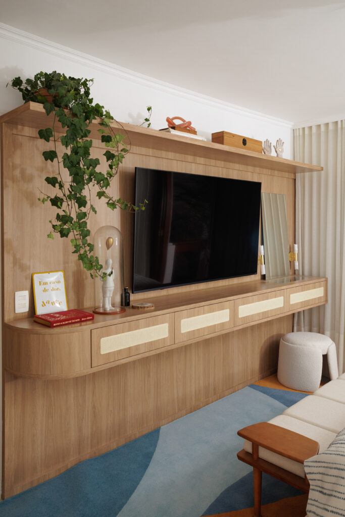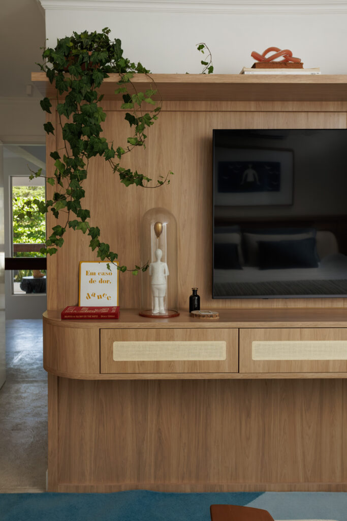 Nos ambientes sociais, estantes, painéis e mobiliários integrados ajudam a criar fluidez, conexão entre espaços e uma estética contínua que traduz o estilo de quem vive ali.