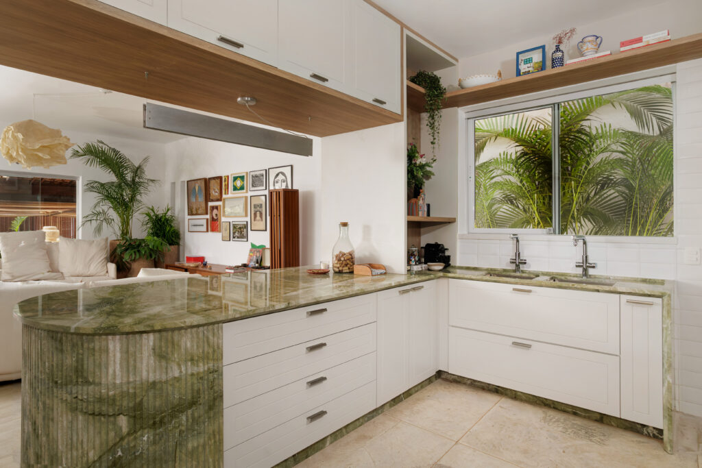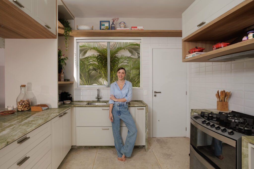 No projeto da casa de Alice Wegmann, essa lógica se revela com clareza. Na área gourmet, um dos espaços preferidos da atriz, os amplos gavetões foram pensados para oferecer acesso fácil, melhor organização interna e praticidade no uso diário. A combinação entre frentes em laca Provençal Eros e o amadeirado Itapuã traduz equilíbrio entre sofisticação, aconchego e atemporalidade. Já a bancada em pedra natural Alga Green, esculpida em curva, transforma o ambiente em arte.